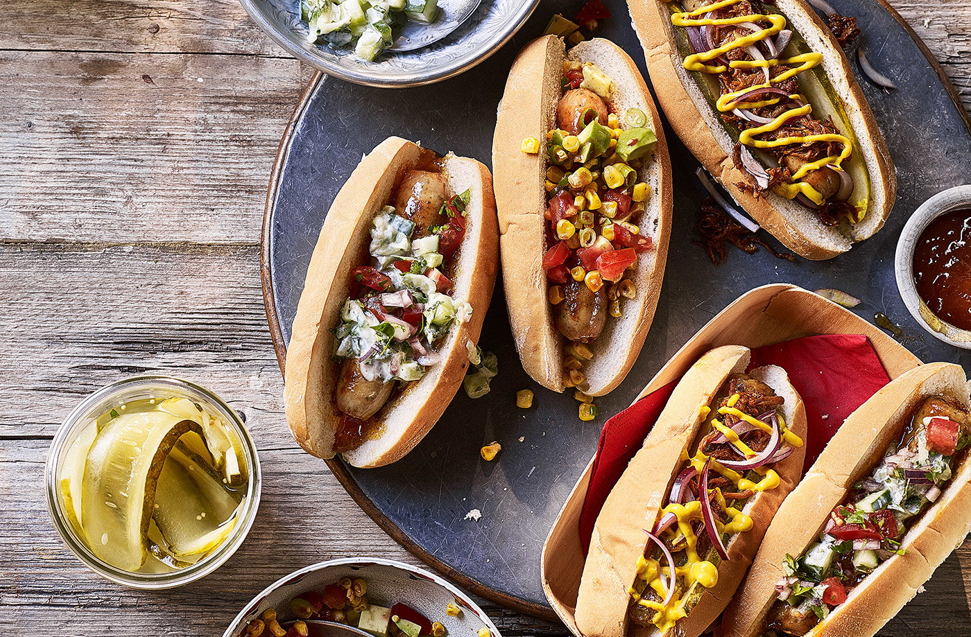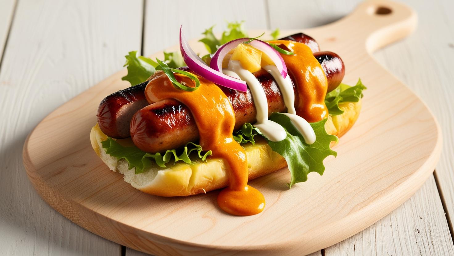 Ingredientes: Salsicha artesanal grelhada, molho picante de abacaxi, cebola roxa marinada, alface crocante, maionese de coco.