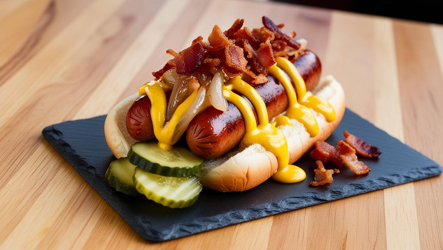 Salsicha artesanal defumada, cebola caramelizada, molho de mostarda e mel, e picles de pepino crocante. Para dar aquele toque extra, um pouco de queijo cheddar derretido e bacon crocante por cima. Uma combinação doce e salgada que nunca sai de moda!