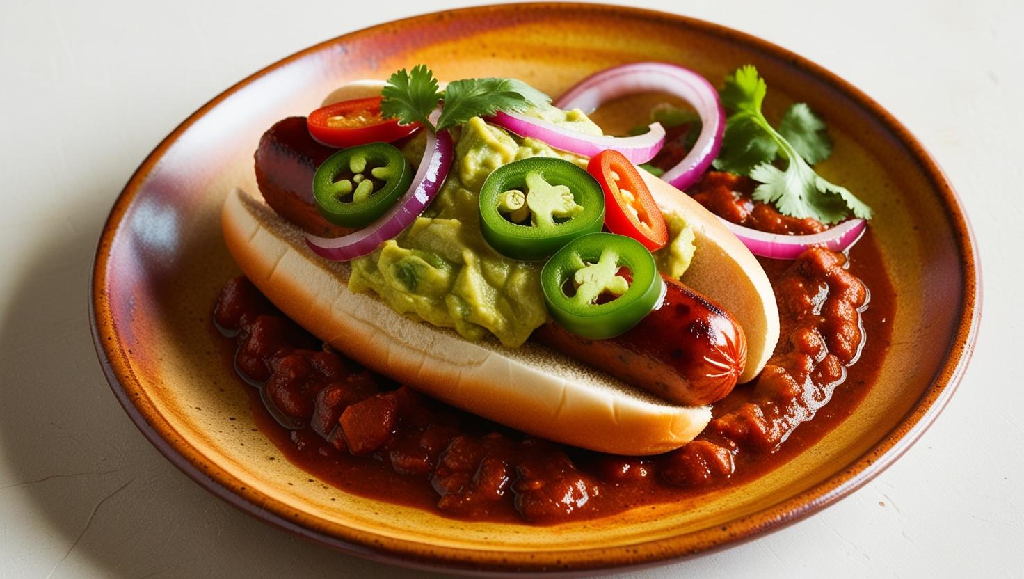 Ingredientes: Salsicha artesanal de frango picante, jalapeños fatiados, guacamole cremoso, molho chili caseiro, cebola roxa marinada, coentros frescos.